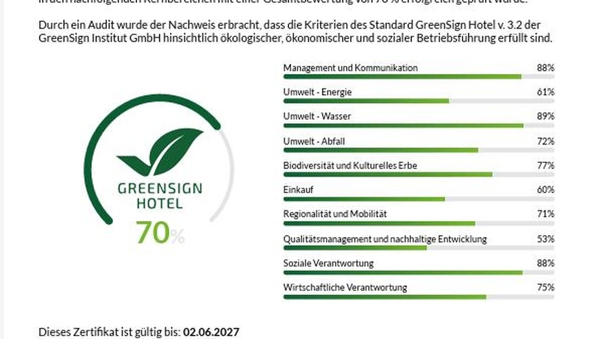 Die GreenSign-Zertifizierung unterstreicht unseren Weg hin zu einem ökologisch, sozial und wirtschaftlich nachhaltigen Hotelbetrieb. Für Sie bedeutet das: ein Aufenthalt mit gutem Gewissen – ohne auf Komfort oder Qualität zu verzichten.